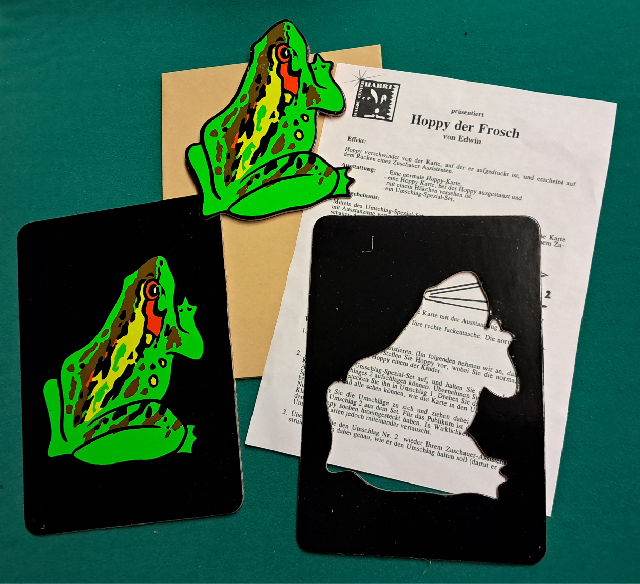 Hoppy wird präsentiert, in sechs Farben auf eine (11,5 x 16,5 cm große) Karte gedruckt. Dann wird er in einen Umschlag gesteckt, den nun einer Ihrer Helfer hält.