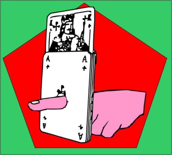 Eine durchbohrte Riesenkarte (Piatnik) durchdringt den Finger eines Zuschauers.