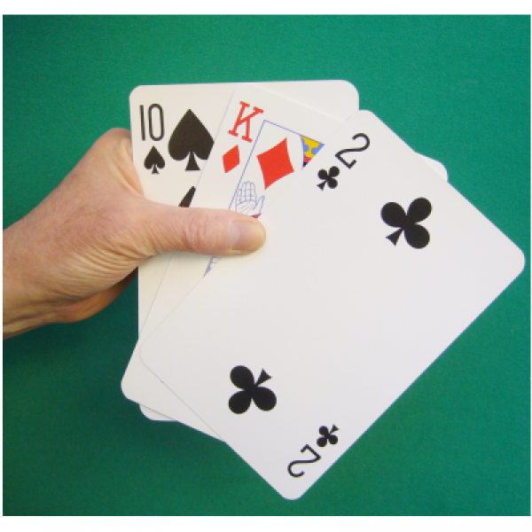 Sie fächern drei Jumbo-Karten auf und zeigen den Zuschauern, dass sich eine rote Karte (König) zwischen zwei schwarzen Karten befindet.