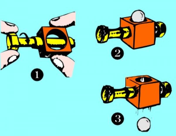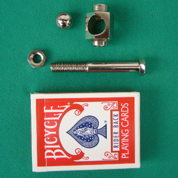 Sie lassen einen durchbohrten Messingblock, eine Messingschraube mit Mutter und eine Stahlkugel untersuchen. - Dann schieben Sie die Schraube durch den Block und sichern sie durch die Mutter. Obenauf kommt die Stahlkugel.