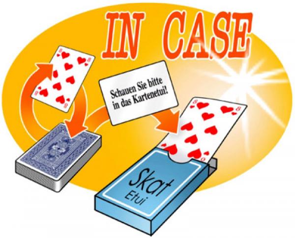 Der Zuschauer zählt nun die Karten, schaut sie durch und stellt fest, dass seine Karte verschwunden ist. - Die umgedreht im Spiel liegende Karte trägt jetzt die Aufschrift: “Schauen Sie bitte in das Kartenetui!”.