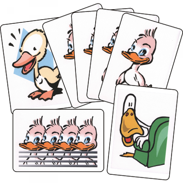 Sie präsentieren einen (ca. 22 x 31 cm) großen Rahmen aus Kunststoff und entnehmen ihm fünf Karten im DIN A5-Format, auf denen Mutter Ente und vier Entenkinder farbenfroh abgebildet sind. “Dies sind Dicky und Nicky, Mama, Ricky und Tricky” stellen Sie die Mitwirkenden vor.