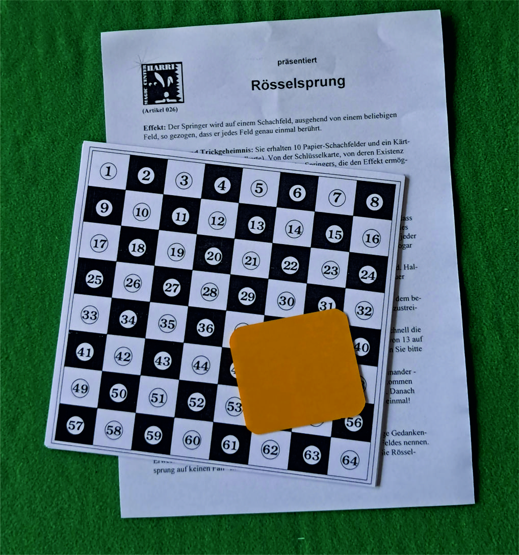 Sie überreichen einem Zuschauer ein kleines Schachbrett aus Papier, dessen Felder von 1-64 durchnummeriert sind. Sie erklären kurz, welche Züge einem Springer (dem Rössel) im Schachspiel erlaubt sind und ein uraltes und vieldiskutiertes Problem: "Ist es möglich, den Springer so über ein Schachbrett zu ziehen, dass er mit legalen Zügen jedes Feld auf dem Brett berührt, aber kein Feld zweimal?"