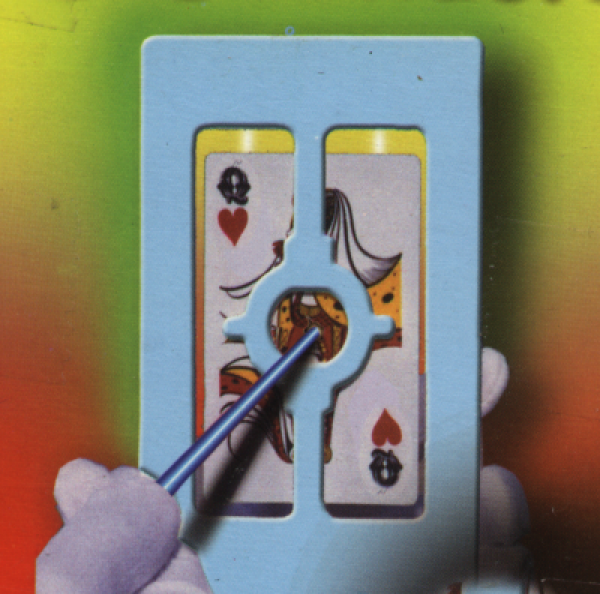 Um das zu beweisen, holen Sie einen Bleistift hervor und bringen gleich darauf einen kleinen Kunststoff-Rahmen zum Vorschein. Dieser Rahmen umschließt eine Plexi-Glas-Scheibe, auf die Sie nun vorne wie hinten je eine Karte klemmen.