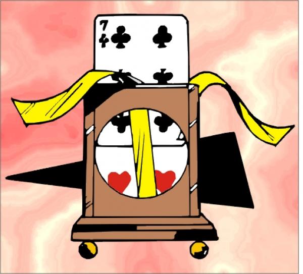 - Nun ziehen Sie den Rest des Kartenspieles (mittels eines Seidenbandes als Entnehmehilfe) heraus. Die oberste Karte des Spieles soll der Zuschauer jetzt umdrehen.