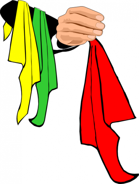 Irgendwann im Verlauf des Programms materialisiert sich in der rechten Hand des Künstlers ein 45 x 45 cm großes Seidentuch. - Mit zwei Fingern nimmt der Vorführende es fort. Eine Sekunde später erscheint in der rechten Hand ein zweites Tuch anderer Farbe. Und dann erscheint auch noch ein drittes.Eine Produktion von seltener Schönheit, da sie blitzschnell vor sich geht und jedes Tuch sofort in seiner vollen Größe sichtbar wird.