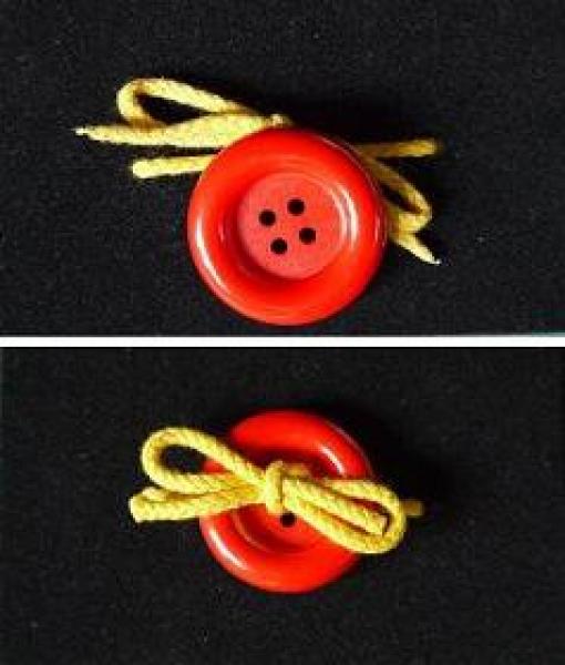 Sie zeigen ein schwarzes Täfelchen vor, welches mit 2 Löchern versehen ist, durch welche eine Kordel verläuft und deren Enden fest zu einer Schleife gebunden sind. - Darauf legen Sie nun einen großen Knopf und abschließend ein Tuch. Das alles bekommt ein Zuschauer zum Halten.