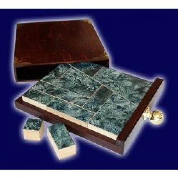 Einer wunderschön verzierten Edelholzschatulle entnehmen Sie 10 marmorierte Holzblöckchen, die zu einem Rechteck von 14 x 12 cm zusammengelegt sind und um die ein Rahmen ganz genau passt: Ein mysteriöses Puzzle.