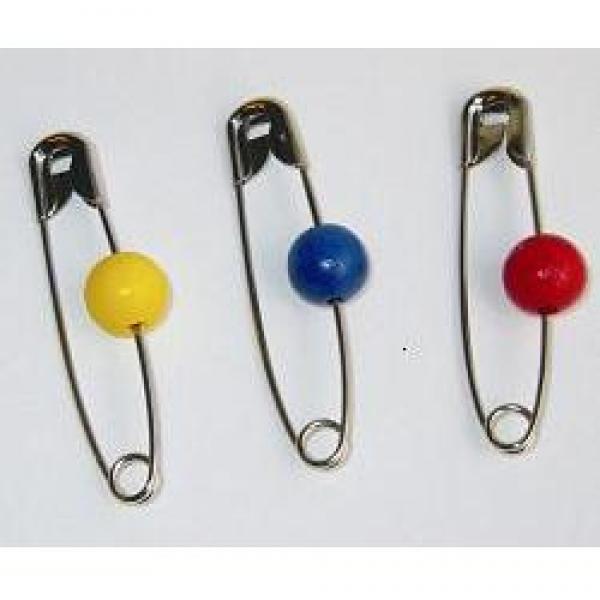 Drei verschiedenfarbig Perlen befinden sich auf Sicherheitsnadeln.