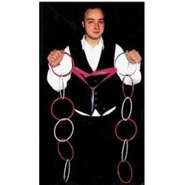 Der Vorführende nimmt einen 15 cm großen Kunststoff-Ring auf. Dann zeigt er seine Hand leer vor und greift mit ihr “ein unsichtbares Etwas” aus der Luft. Sofort bringt er die Rechte für den Bruchteil einer Sekunde an der unteren Rand des Kunststoff-Reifens, und augenblicklich materialisiert sich dort das Etwas zu einem farbigen Seidenband, dessen Enden zusammengeknotet sind. Und dieser Bandring ist mit dem Reifen verkettet!