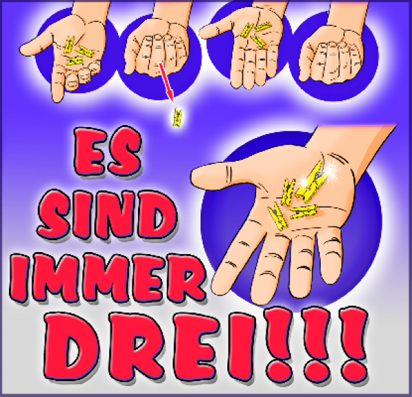 Sie zeigen drei Mini-Wäscheklammern (aus der Puppenstube Ihrer Tochter) vor. Man sieht einwandfrei, dass es sich um drei Stück handelt ("Es sind immer 3!"). Eine davon legen Sie auf die geschlossene linke Faust. In der rechten Hand verbleiben, deutlich sichtbar, nur noch zwei Klammern. Sie geben das Kommando zur Wanderung und halten – Simsalabim - links zwei Klammern; plus einer aus der rechten Hand, macht drei ("Es sind...").