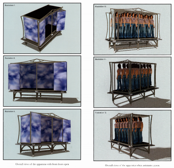 In this version an elevated framework structure, screened with fabric is shown completely empty & revolved 360 degrees. In an instant the fabric is stripped away revealing the surprise appearance of 26 people.